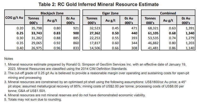 The Initial Mineral Resource Estimate of 1,340,000 ounces of gold at the RC Gold Project is comprised of two deposits: the Blackjack deposit containing 900,000 ounces of gold at a grade of 0.83 g/t gold and the Eiger deposit containing 440,000 ounces of gold at a grade of 0.50 g/t gold (see news release dated January 19, 2023). Both of these deposits are at/near surface, are potentially open pit minable and amenable to heap leaching, with initial bottle roll tests indicating that the gold is not refractory and has high gold recoveries of up to 94% with minimal NaCN consumption (see News Release July 13, 2022).